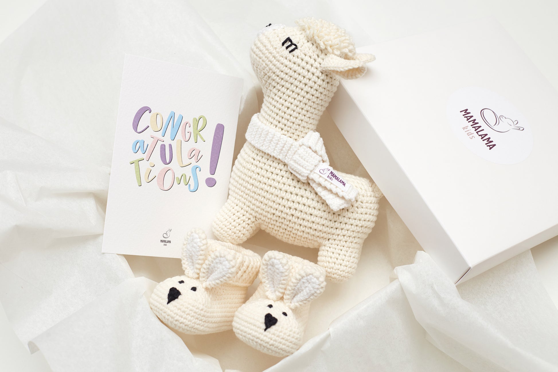 This is a gift box set which consists of a toy, booties, tissue paper, and a cute white box.