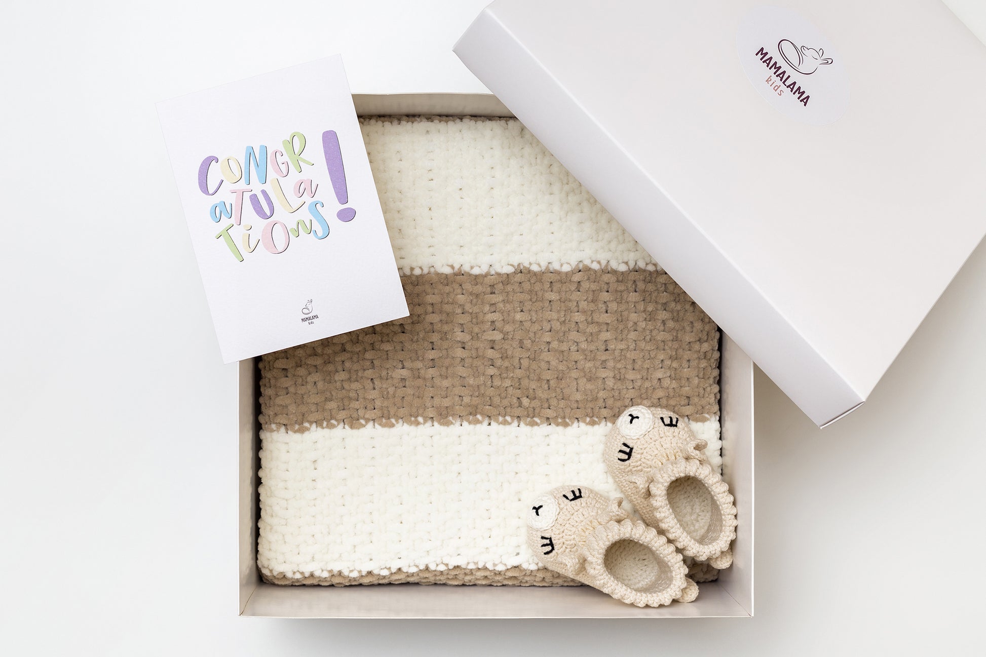 This is a gift box set that consists of a blanket, booties, tissue paper, and a cute white box. The blanket is 100x80 cm or 39.3x31.4 inches.
