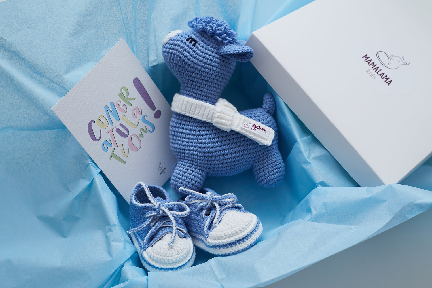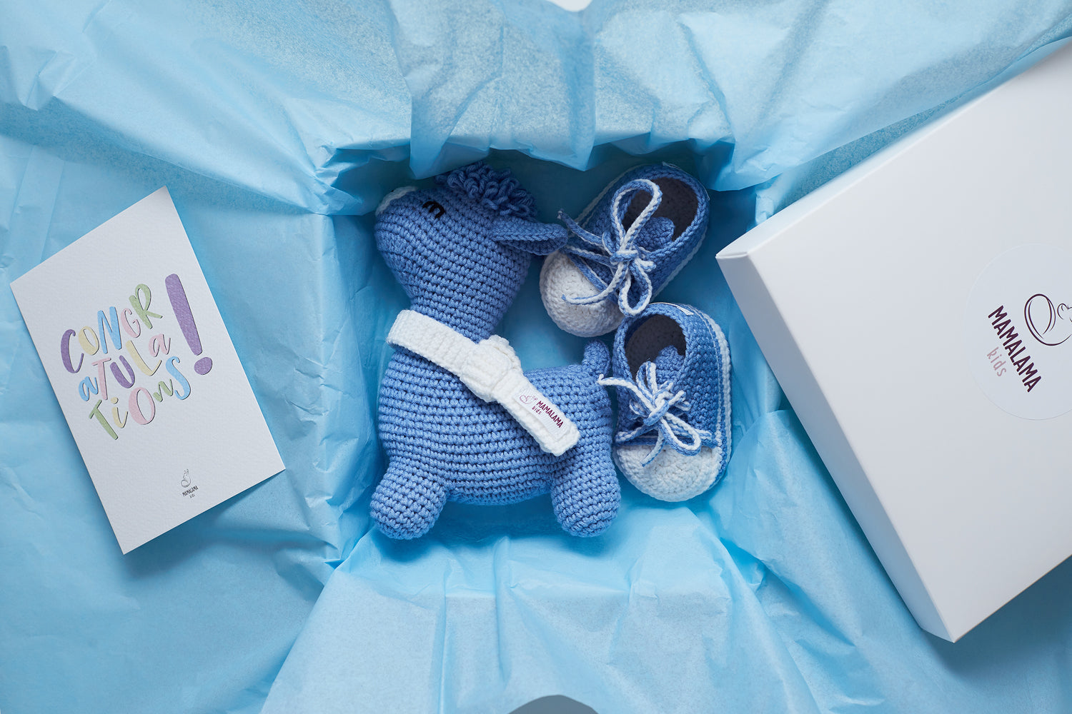 This is a gift box set which consists of a toy, booties, tissue paper, and a cute white box.