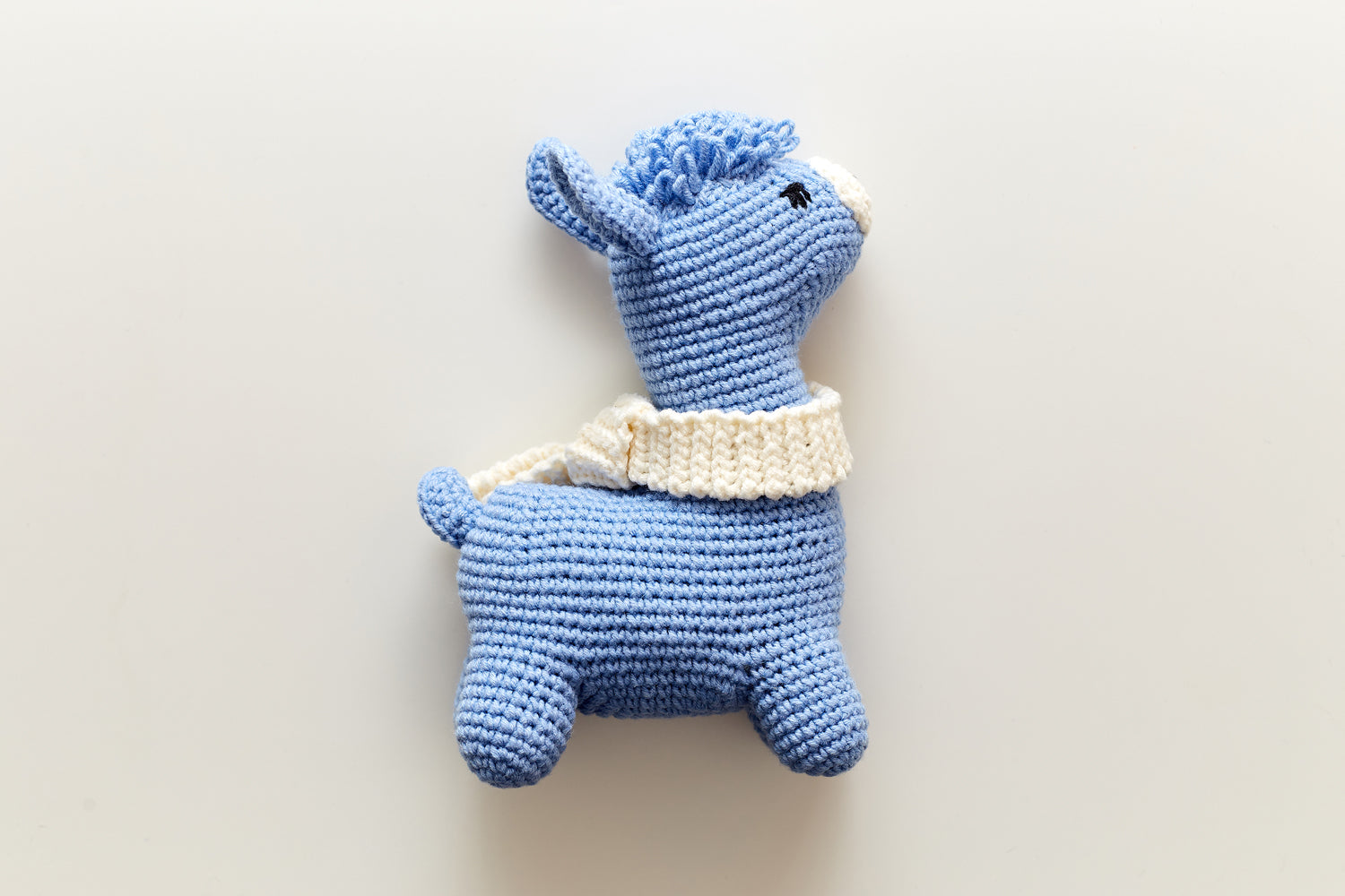 The toy is 16 cm (6.29 inch) high. Just perfect size for play, joy and decor. The toy and the booties are hand crocheted of the baby cotton yarn so are suitable even for newborns as a toy or teether.