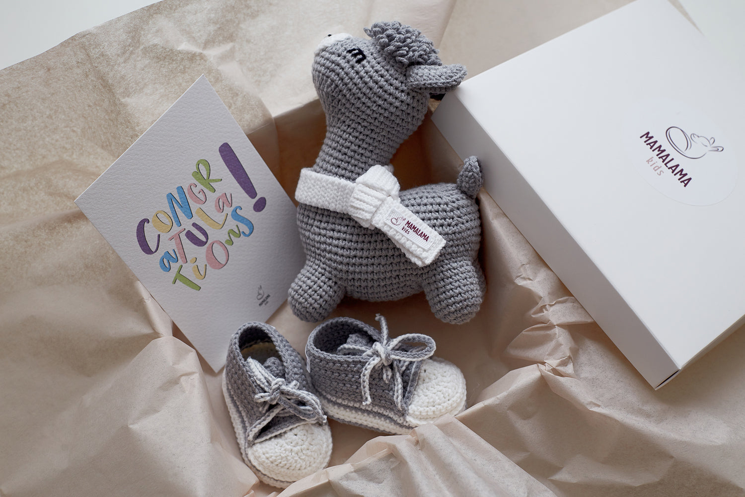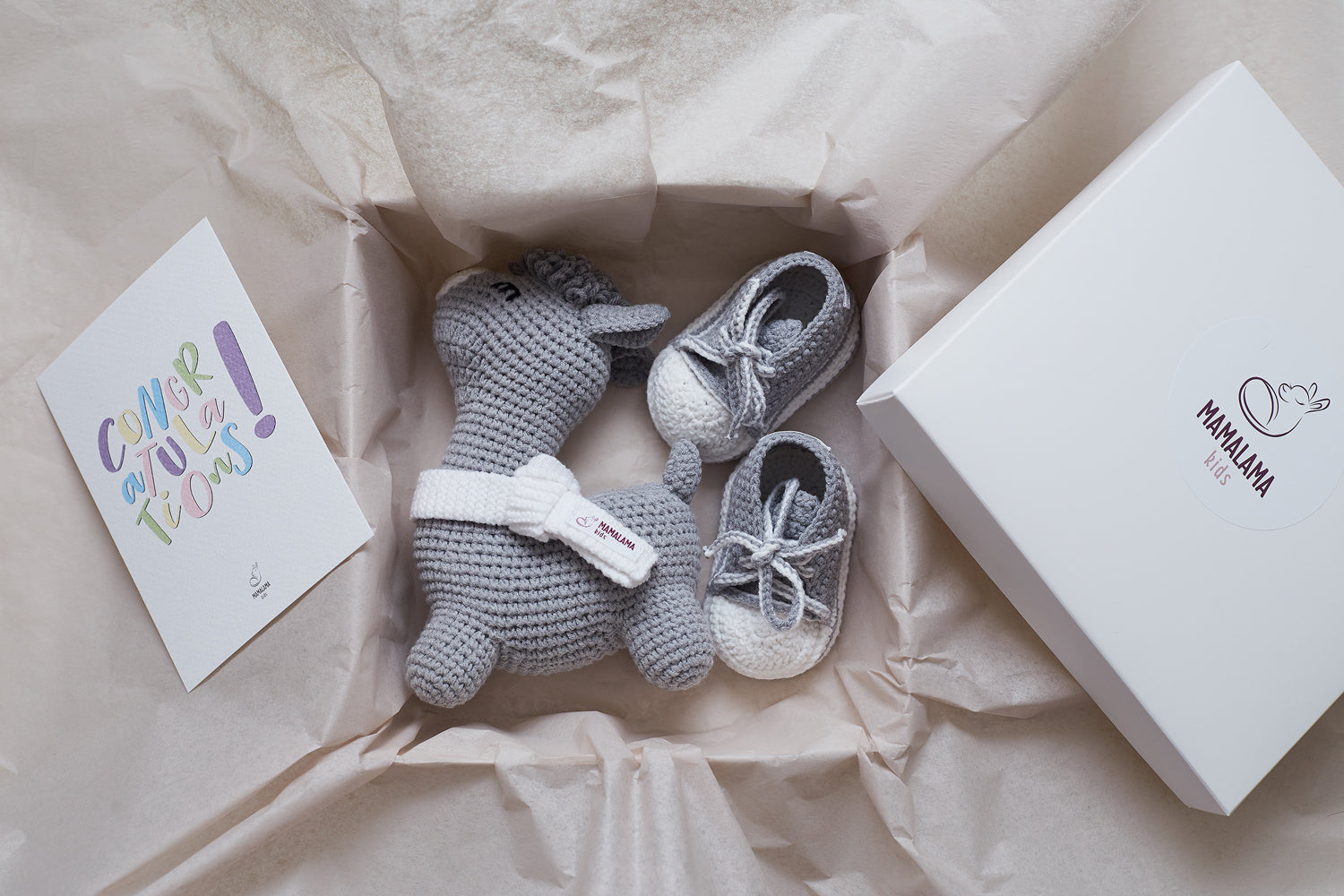 This is a gift box set which consists of a toy, booties, tissue paper, and a cute white box.