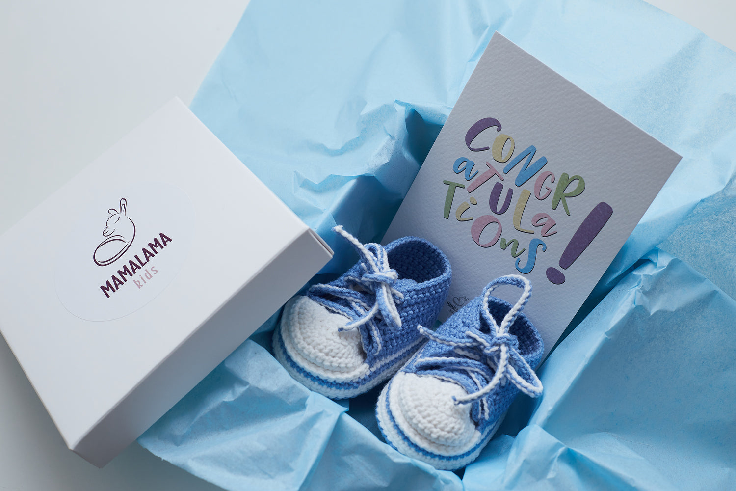 Unique pregnancy gift box pregnant woman or for mom to be with cute sneakers booties. Newborn soft sole shoes congratulations basket.